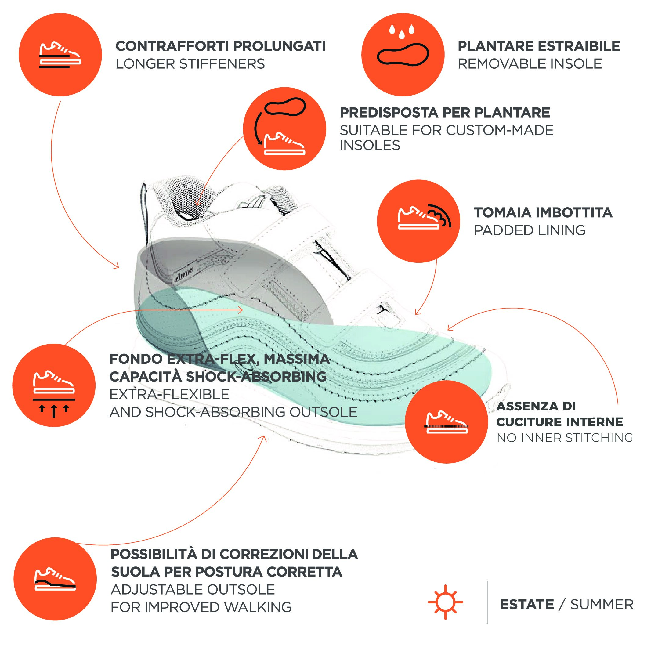 Calzature terapeutiche predisposte, extraflessibili e dotate di plantare estraibile. Grazie a un sistema combinato di fori e tessuti traspiranti, offrono leggerezza e flessibilità senza rinunciare a un adeguato sostegno strutturale. Il plantare, progettato per accompagnare il piede in modo dinamico, garantisce elasticità e stabilità, favorendo la massima efficacia biomeccanica durante il cammino del bambino.